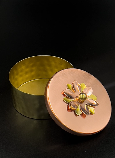 Material: Metal, Keep your dry fruits and cookies fresh and organized with our elegant Copper Dry Fruit Box. Crafted from high-quality metal, featuring intricate copper and floral embossed designs and a secure lid. Perfect for gifting on special occasions like Marriage, Housewarming and other special Events.