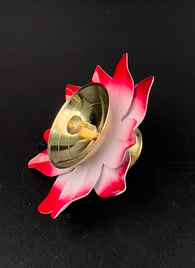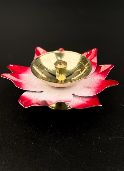 Flower shaped BRASS DIYA, handpainted decorative pooja utility !.It is made of brass and has a smooth copper coated finish handpainted in orange. The diya is fitted with a flower design base making it beautiful.This can ideally be placed in pooja rooms to spread a strong sense of spirituality.Top Diya Dia – 1.5Inches Bottom Diya Dia – 0.9Inches