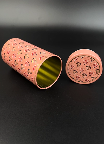 Product: Tin Jar, Material: Tin, Color: Peach. This tin jar is printed with abstract designs and come with a lid. It is very trendy and best suited to use on a regular basis. You can gift these tin jars to your friends and family as a return gift on any occasion such as housewarming, navratri, etc.